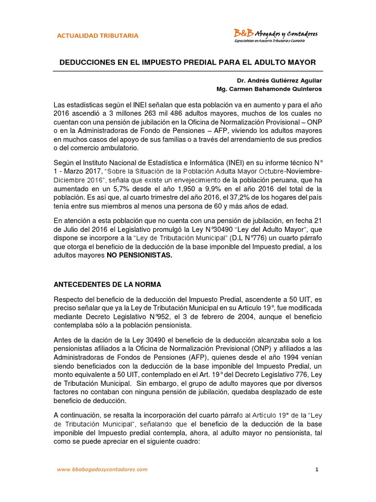 En principio, la ley n° 30490 no habla de una exoneración y tampoco en sus normas vinculantes, sino de un descuento para las según explica el abogado tributarista jorge rodríguez cueva, los adultos mayores tienen una cierta ventaja en el pago del impuesto predial, más no en el pago de arbitrios. Y que hacer si se a seguido pagando pasado los 60 años. 30490, ley de la persona adulta mayor, se reducirá en 50 unidades impositivas tributarias (uit) de la base imponible del impuesto predial el pago del tributo las personas mayores de 60 años que tengan inmuebles en el cercado de lima. El impuesto predial, se conoce en colombia como un aporte económico proporcional a los predios (viviendas) que posee cada individuo colombiano. Portada impuestos impuestos territoriales por gerencie.com el impuesto predial es de causación anticipada, es decir, que no se causa una vez termina el periodo quiero saber cual es la norma, decreto o ley que le permite a catastro elevar al 100% del valor.